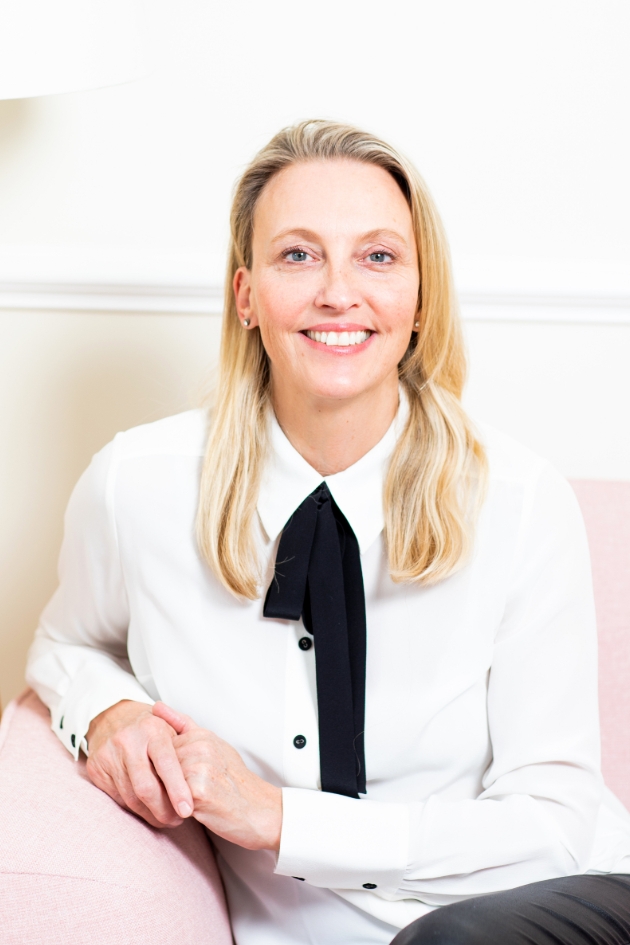 Blonde woman sat on pink chair wearing a white shirt with black bow detail