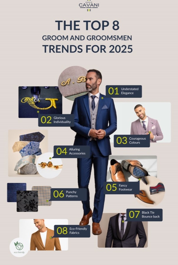 So, all in all, 2025 promises to be an exciting and diverse year for groom and groomsmen wedding trends. From courageous colours to punchy patterns and from effortless elegance to strong personality, a vibrant new era when fresh, daring designs aligned with fashion’s oldest traditions awaits the world of men’s wedding attire.