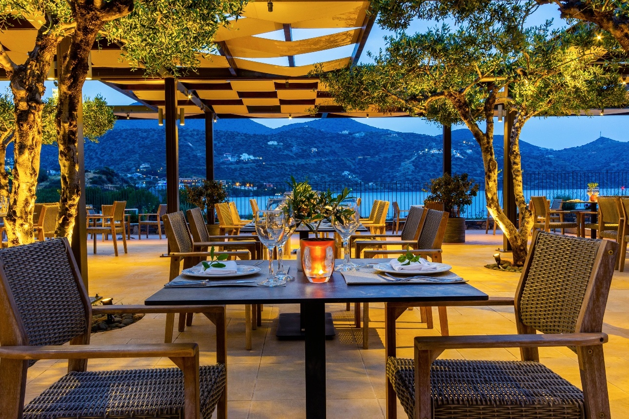 tables al fresco on covered terraced at night sea and mountain views
