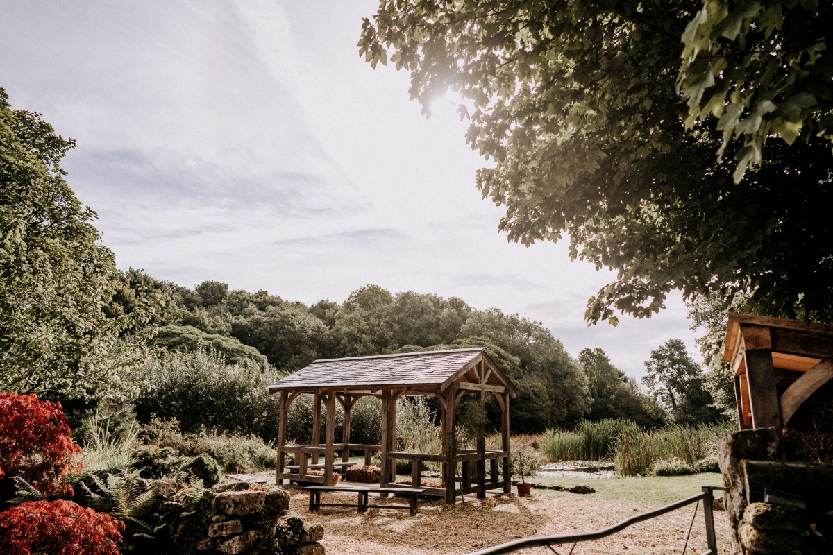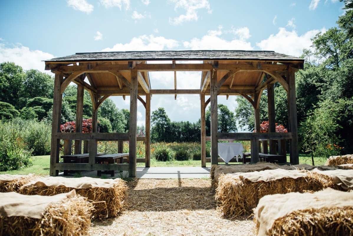Ceremonies take place indoors and out. The second floor of the Threshing Barn, that has disabled access, holds up to 90 guests and is used for all indoor ceremonies. Outside, the arbour overlooking the pond and lawns leading down to the orchard is a traditional oak structure with a Cornish slate roof and seats up to 90 loved ones on rustic-inspired straw bales. It's a peaceful spot for small and large gatherings, and the nearby pond makes a wonderful photo opportunity in summer when it's topped with lily pads and surrounded by bulrushes and wildflowers. Blessings can take place here, as well as in the orchard and vine polytunnel, and it's also a superb spot for drinks and canapés.The wedding breakfast and reception takes place in the Threshing Barn for up to 120 guests seated, or 160 loved ones standing during the evening. Guests have the option to relax upstairs with dancing taking place downstairs, and the venue benefits from a late licence. For those wanting to host all of their celebrations outside, the courtyard can be set up for outdoor dining for up to 120 guests seated at long banquet tables in addition to the top table. It's also a great spot for a drinks reception and looks romantic at night decorated with festoon lighting and bunting. Within the courtyard, there's a small lawn, ideal for a spot of croquet. More garden games and even a traditional egg-and-spoon race can be arranged in the orchard and most of the site is safe for children, although there's a designated children's play area.