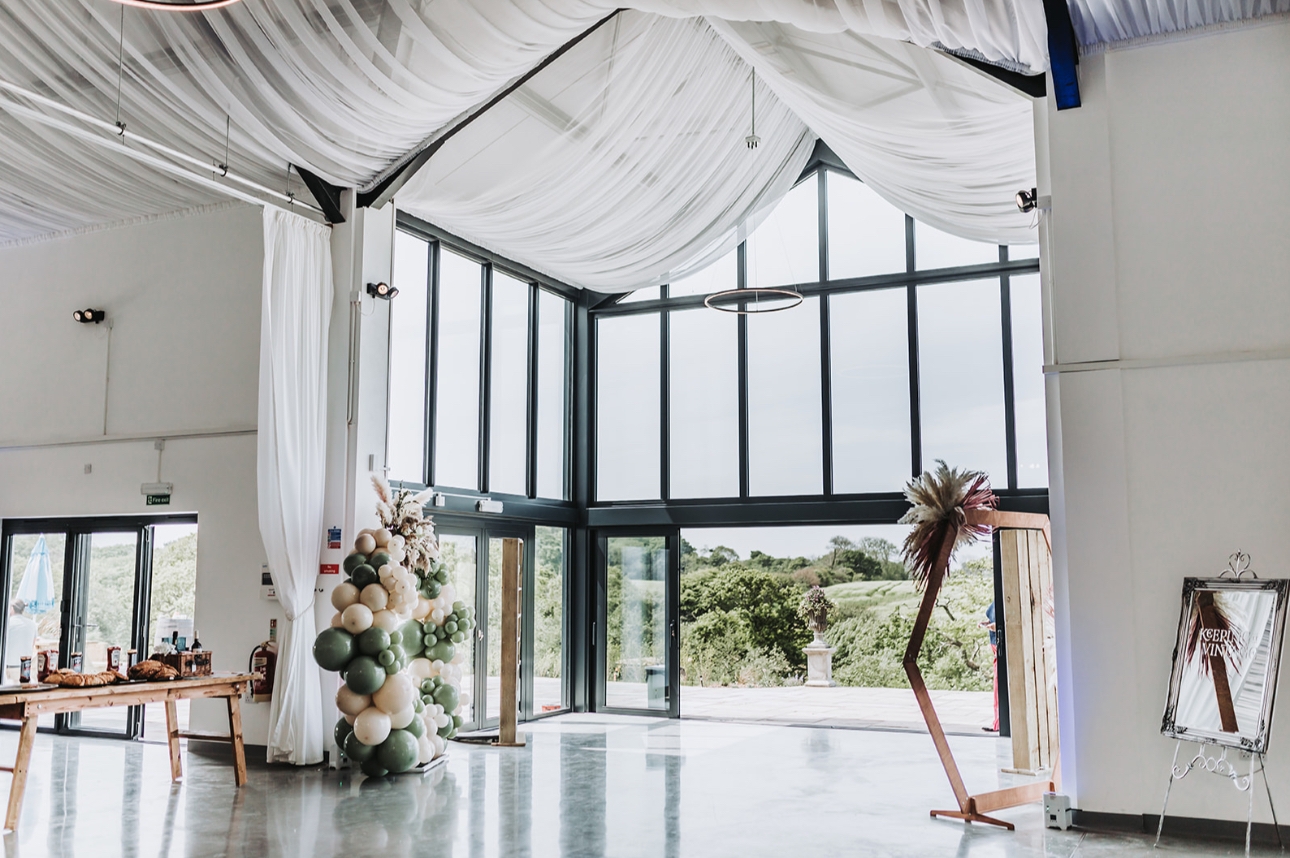 The Barn at Pengelly located in Truro, Cornwall is a stylish new purpose-built wedding venue with its statement glass entrance foyer located on a working farm overlooking rolling hills and sprawling lakes. Featuring two outdoor terraces where lawn games can be enjoyed, the venue offers an outdoor ceremony area under a pagoda on the lower terrace with views of the lakes. Alternatively, the spacious indoor area can hold a large party of up to 300 guests for the ceremony and up to 400 people for the reception, and an Insta-worthy feature is a rustic-inspired bar that's handmade from ash trees that have fallen on the farm.