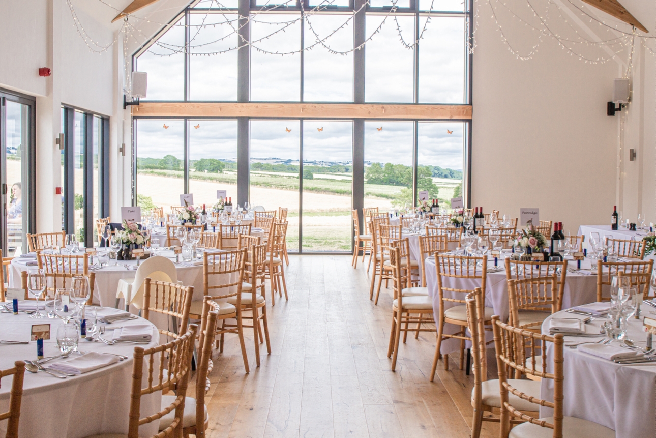 Harefield Barn is a wedding photographer's dream, being light and airy thanks to the gable end window and with a modern and spacious yet homely feel. Glass walling is used extensively to showcase the fabulous views. Three sets of large bi-fold doors open out on to the spacious paved terrace from both the Sawpit Bar and Main Hall, with crisp horizontal boarding finishing the exterior, and the terrace flows seamlessly on to extensive lawn areas and the field beyond.
