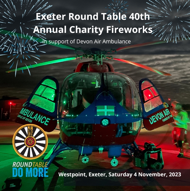 Exeter Round Table's annual firework extravaganza returns for its 40th anniversary, in support of Devon Air Ambulance, on Saturday 4th November 2023. Devon Air Ambulance is delighted that Exeter Round Table has once more chosen to support the charity with this popular event.