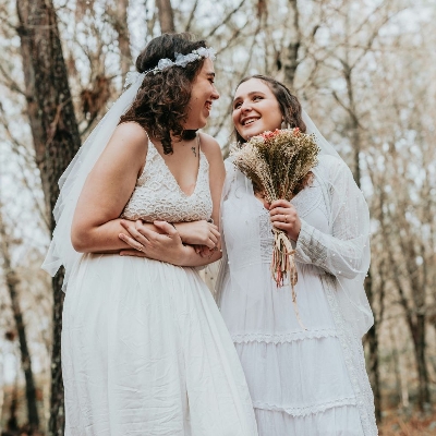 Celebrant with two brides in the woods
