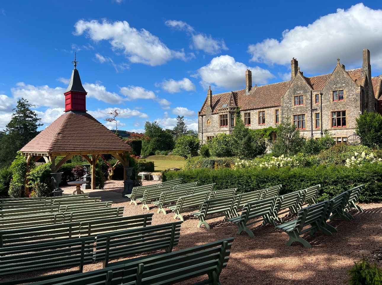 Outdoor ceremonies can take place under the old oak Dovecote, under the tipi positioned in the meadow garden, on the upper lawn against a backdrop of rolling hills or under the canopy of the giant ancient trees. Inside, the décor is classic country house chic – eclectic yet homely offering the best of both modern comfort married and timeless style. Nuptials can be exchanged in the book-lined library, in the Jacobean oak-panelled Great Hall with its marble archways and in the Tapestry Diamond Room or the Yellow Ballroom.