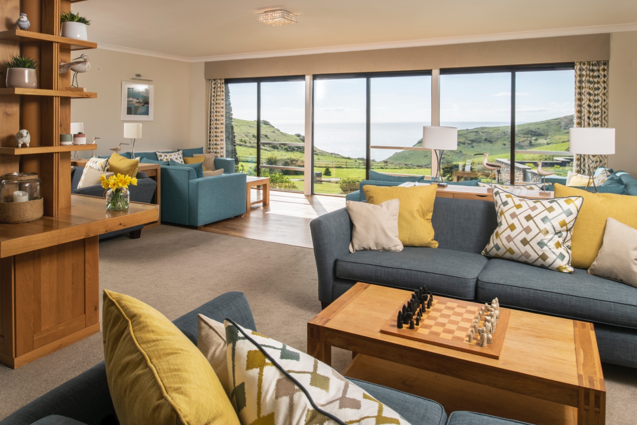 The hotel offers a range of sea-facing rooms featuring patio doors opening onto sun-soaked wooden decks with wicker loungers. There are family suites, rooms for couples, and two self-catering villas for larger groups. The main restaurant offers modern British cuisine with a focus on local seafood and meats. A smaller dog-friendly restaurant and a lounge with wicker swing seats provide additional dining options. The hotel's champagne bar caters to those with more spirited tastes.