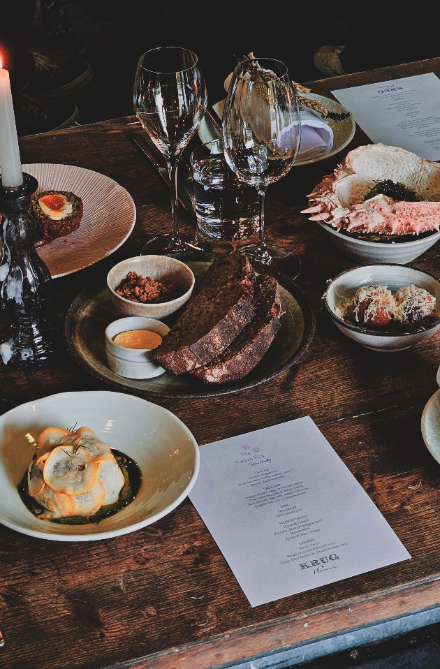 The day finishes with a seafood feast, where guests savouring their dishes are also presented with The Tartan Fox's snacks, crab cocktail, sides such as seaweed pickled cabbage and masala fries, and two delicious dessert options: lemon tart and torched meringue and custard tart with Cornish fairings.